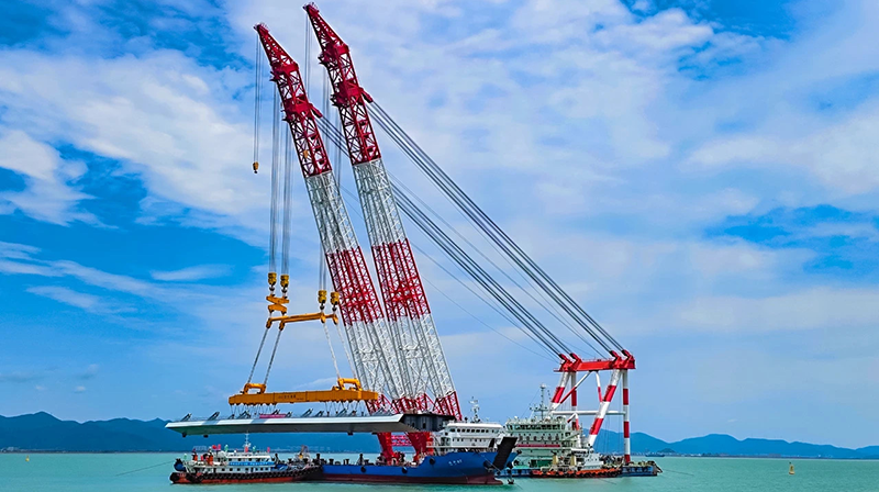 寧波至象山市域(郊)鐵路象山港跨海大橋主橋邊跨結(jié)合梁架設(shè),巨力索具鋼箱梁吊具全程保障項目吊裝。