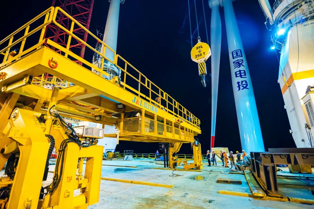 2021年8月19日,華能山東半島南4號海上風電項目順利完成首臺風機“整體”吊裝,風機整體最大重量為650噸,該吊裝設備包括運輸底座、井字架、平衡梁、電氣系統、液壓系統、緩沖系統等部件構成,是巨力索具在北方沿海地區海上風電首個風機整體吊裝項目。開創了國內海上風電實施5.0兆瓦以上單樁基礎風機整體吊裝先河。