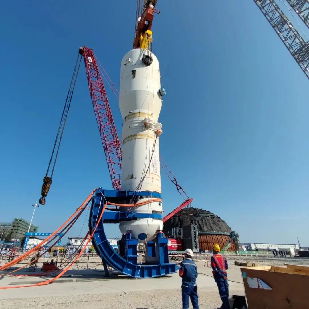 2022年8月,“華龍一號”漳州核電2號機(jī)組穩(wěn)壓器通過“主設(shè)備預(yù)引入法”順利吊裝就位,巨力索具通過項(xiàng)目現(xiàn)場移動(dòng)式翻轉(zhuǎn)支座、翻轉(zhuǎn)抱環(huán)、拉緊裝置,提供吊桿及吊梁等翻轉(zhuǎn)吊裝產(chǎn)品,使用3200t吊車在反應(yīng)堆廠房外翻轉(zhuǎn)、吊裝引入至穩(wěn)壓器間,全程保障項(xiàng)目吊裝順利進(jìn)行。
