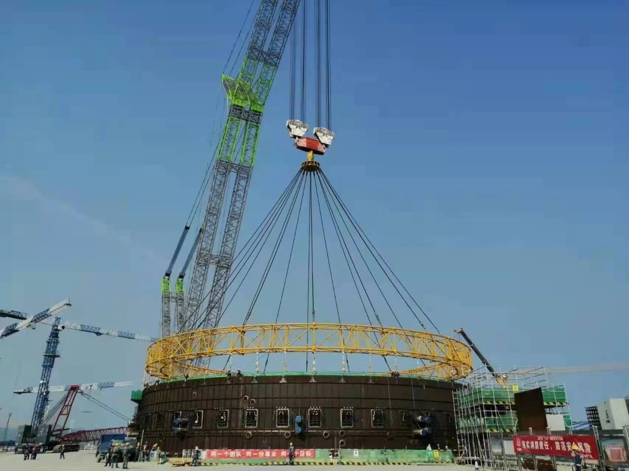 2017年5月25日,“華龍一號”核電站全球首堆福清核電5號機(jī)組穹頂?shù)跹b開始,吊裝的整套吊裝工具均由巨力索具提供,吊裝系統(tǒng)包含1140噸級的圓形過度梁,16個(gè)大型吊耳,16根100噸級的閉式澆筑鋼絲繩索具、16套1140噸級的可調(diào)拉桿裝置,為穹頂?shù)捻樌跹b提供了可靠的吊裝索具。