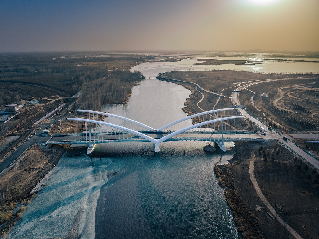 大橋全長259米,造型以鷺鷥涉水時舒展的羽翼為原型,取展翅翱翔,高飛于空的意境,將人文理念融合于雄安灣生態(tài)自然的景觀中。以“展翅高飛”為景觀主題,塑造整體協(xié)調(diào)、重點突出的夜間燈光效果,營造“清新、亮麗、現(xiàn)代、雅致“的夜間橋梁景觀形象。橋梁全線有功能照明和可分級控制的景觀照明,為平日和節(jié)日提供不同的照明效果。