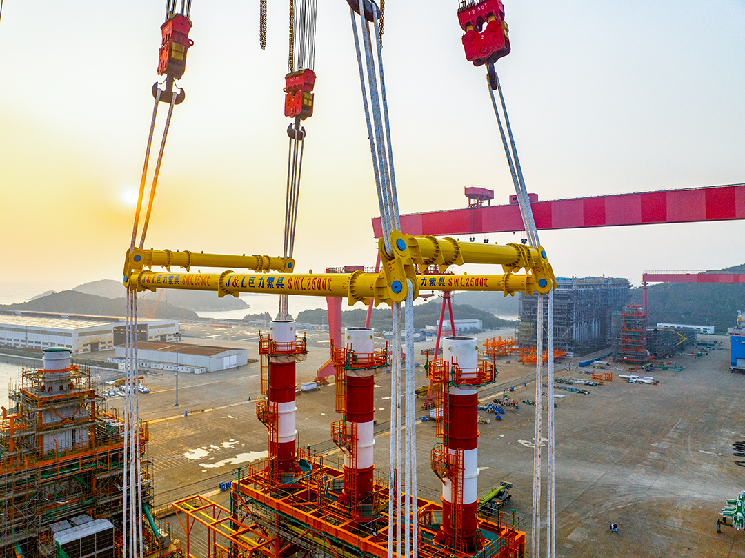 在裝置建造過程中,巨力索具承擔(dān)了該“海上移動化工廠”上部模塊的吊裝集成任務(wù),為項目量身定制了5000T吊梁系統(tǒng)。這套裝備需承受FLNG模塊吊裝過程中的動態(tài)載荷,技術(shù)要求遠超常規(guī)海工項目,是項目建設(shè)中技術(shù)難度最高、風(fēng)險最大的環(huán)節(jié)之一。