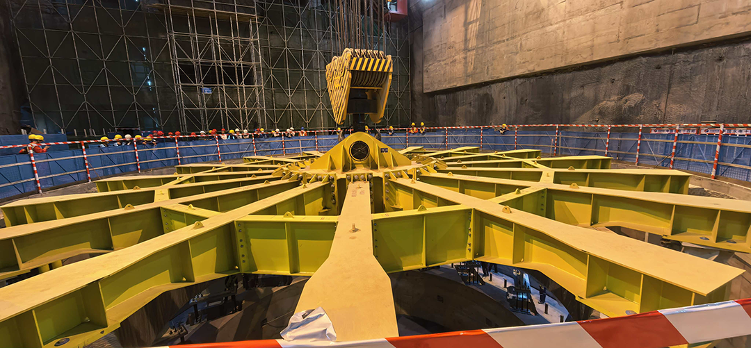 定子作為發(fā)電機組的重要核心部件,主要由機座、鐵芯和繞組三大部件組成。此次吊裝的定子外徑達(dá)16.4米,高5.6米,由22萬張0.5毫米厚的硅鋼片疊裝而成,總重量達(dá)544.3噸。