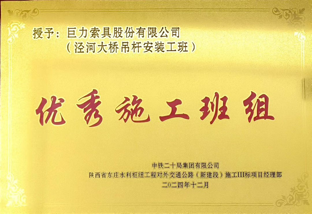 在吊索安裝環節,巨力索具團隊積極優化作業流程,對吊索安裝張拉后的穩定進行觀測,確保安裝進度與質量,為大橋的順利通車提供了關鍵保障。巨力索具團隊也因出色的現場表現,被項目部授予“優秀施工班組”的榮譽稱號。