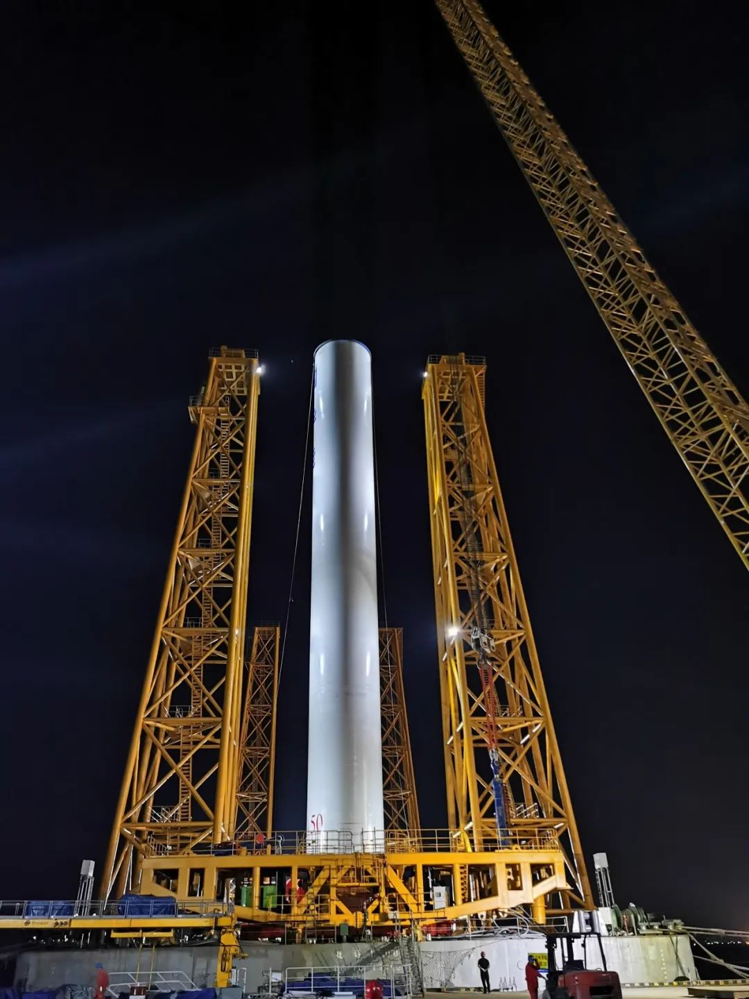 巨力人面對疫情、臺風(煙花)、炎熱酷暑(近40°C高溫)多重不利因素條件下迎難而上,在做好防護同時,有序組織生產,保安全、搶抓工期。并于8月18日完成風機陸上拼裝,8月19日完成首臺風機整體吊裝。
