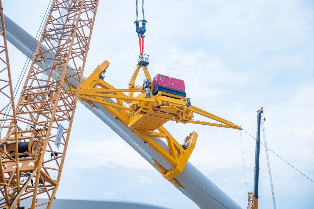 大兆瓦全角度海上單葉片吊具可滿足單只葉片最大承重50噸。同時,將原有的吊裝窗口平均風速提升至15m/s,最大陣風風速可達18m/s,極大拓寬了風機吊裝窗口期,突破了海上吊裝作業風速邊界限制,是又一款海上風電單葉片吊裝“利器”。