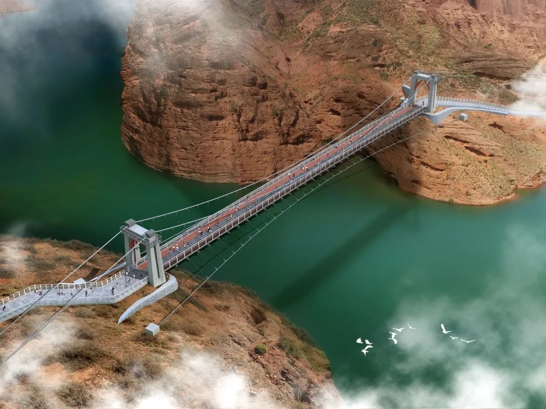 青海坎布拉景區人行懸索橋全程跨度110米,橋梁寬6米,人行道凈寬5米。大橋位于李家峽水庫入口附近,橋梁連接水庫入口兩岸,兩端連接旅游人行棧道,坎布拉丹霞地貌多以奇峰、峭壁為其主要地貌特征,生態環境脆弱,大橋兩岸地勢陡峭,工程地質條件極為復雜,對產品要求極高。