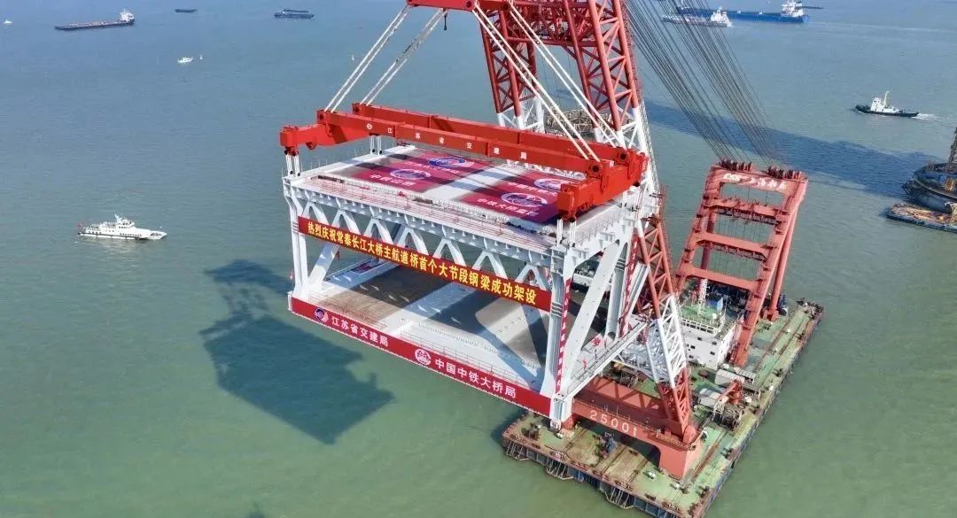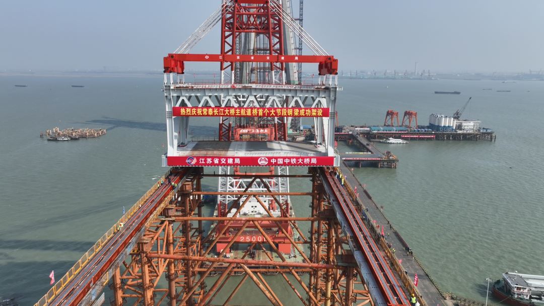 本次吊裝為常泰長(zhǎng)江大橋主航道橋常州側(cè)邊跨首個(gè)大節(jié)段鋼梁,更是全橋首個(gè)大節(jié)段鋼梁,此次鋼梁吊裝完成,標(biāo)志著常泰長(zhǎng)江大橋建設(shè)又邁出堅(jiān)實(shí)的一步。鋼梁吊裝至滑移支架上后,將通過拖拉滑移系統(tǒng)拖拉300m至設(shè)計(jì)位置。