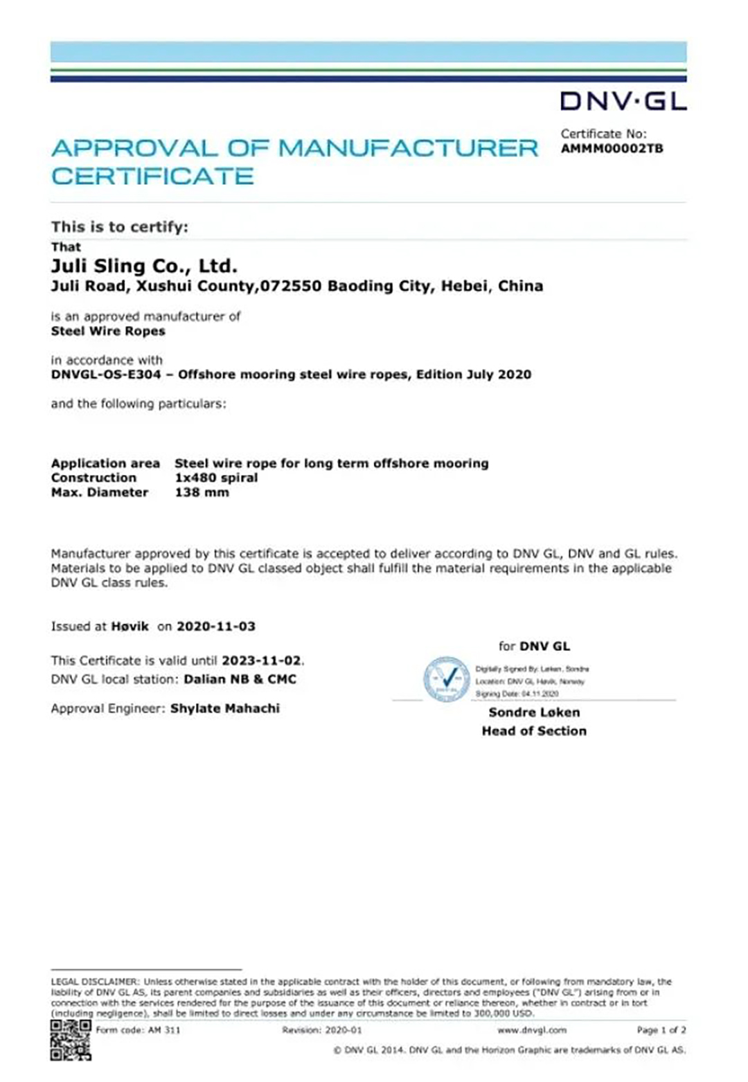 2020年11月,巨力索具取得了永久系泊用單股涂塑鋼絲繩的DNV·GL工廠認可證書,成為國內首家通過該類鋼絲繩DNV·GL工廠認可的廠家。